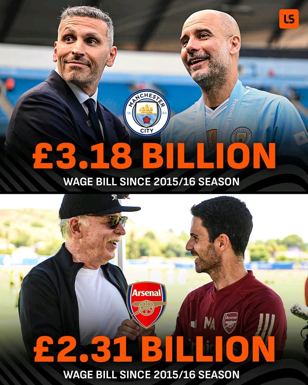 The image says it all. Two clubs. Two modern giants of English football. Two different financial paths. And one staggering comparison that has reignited one of the most heated debates in the Premier League era. Since the 2015/16 season, Manchester City have reportedly spent £3.18 billion on wages. In the same period, Arsenal have spent £2.31 billion. Nearly a billion pounds separates them. That gap is not just a number. It is a story about dominance, ambition, recruitment, pressure, expectations, and the price of sustained success at the highest level of football.
