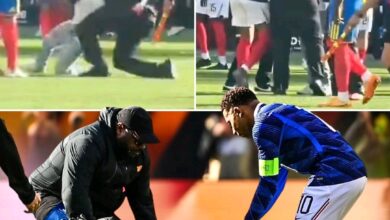 Kylian Mbappe trying to help a pitch invader after they were tackled by security in the France vs. Colombia friendly